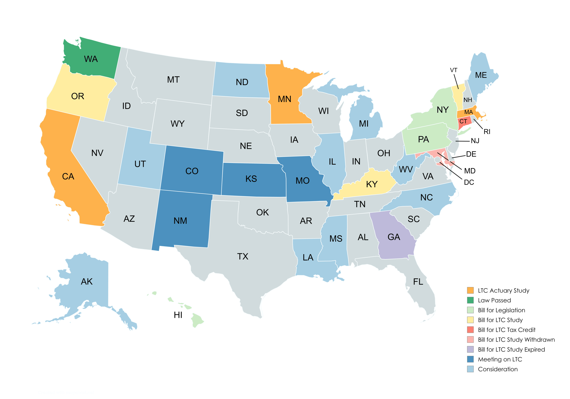 In 2019 the Washington state legislature established the Washington Cares Fund, the nation’s first publicly funded long-term care benefit for eligible workers, to address the future LTC crisis posed by an aging population. This sparked a national conversation about the need for long-term care planning as state Medicaid systems struggle to cover the 70% of Americans that will need LTC in their lifetimes, only 10% of whom have insurance that will pay for it. Many other states have followed suit and are in various stages of evaluating public LTC programs of their own. Depending on how each state designs their plans, qualifying LTC insurance policies may allow individuals to opt out of the payroll tax.